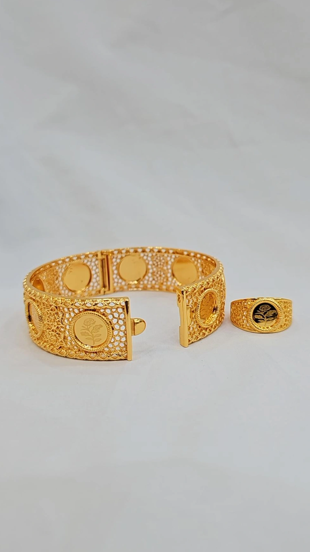 سواره وخاتم نسائي يتميز بجودة حيث انه مطلي بماء الذهب ليكتسب اللمعان والبيريق، تم تصميمه من فريق مختص بتمصميم الذهب ليضيف لك الاناق ولجمالك 🤍